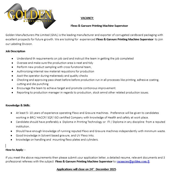 Golden Manufacturers Pte Limited (Golden) is a private company incorporated in Fiji in 1982. Golden is Fiji’s largest manufacturer of Corrugated Cardboard, Packaging and Labels for world renowned companies including but not limited to: - Fiji Water, Star-Kist, Foster Group, Nestle and Coca Cola.