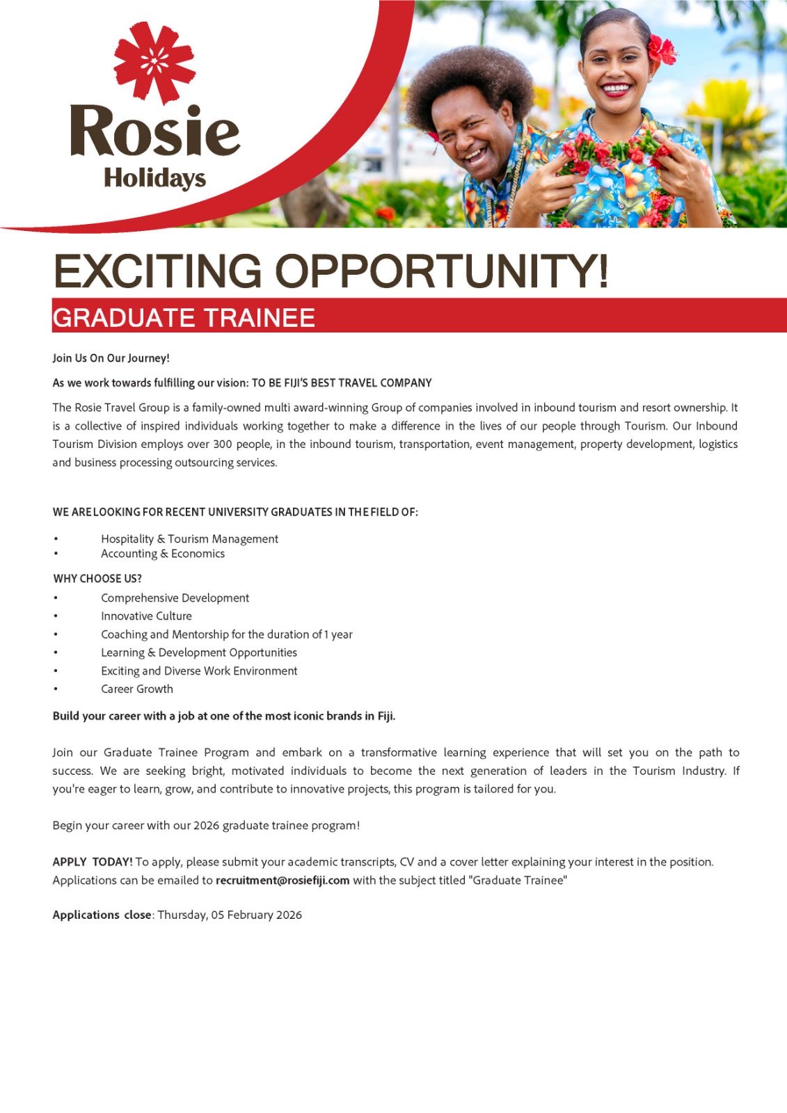 The Rosie Group is a collective of inspired individuals working together to make a difference in the lives and livelihoods of our people through Tourism. We believe that Tourism is a force for good and we inspire by our excellence in services to our people, hope to our communities and happiness to our clients. And we love doing what we do! |