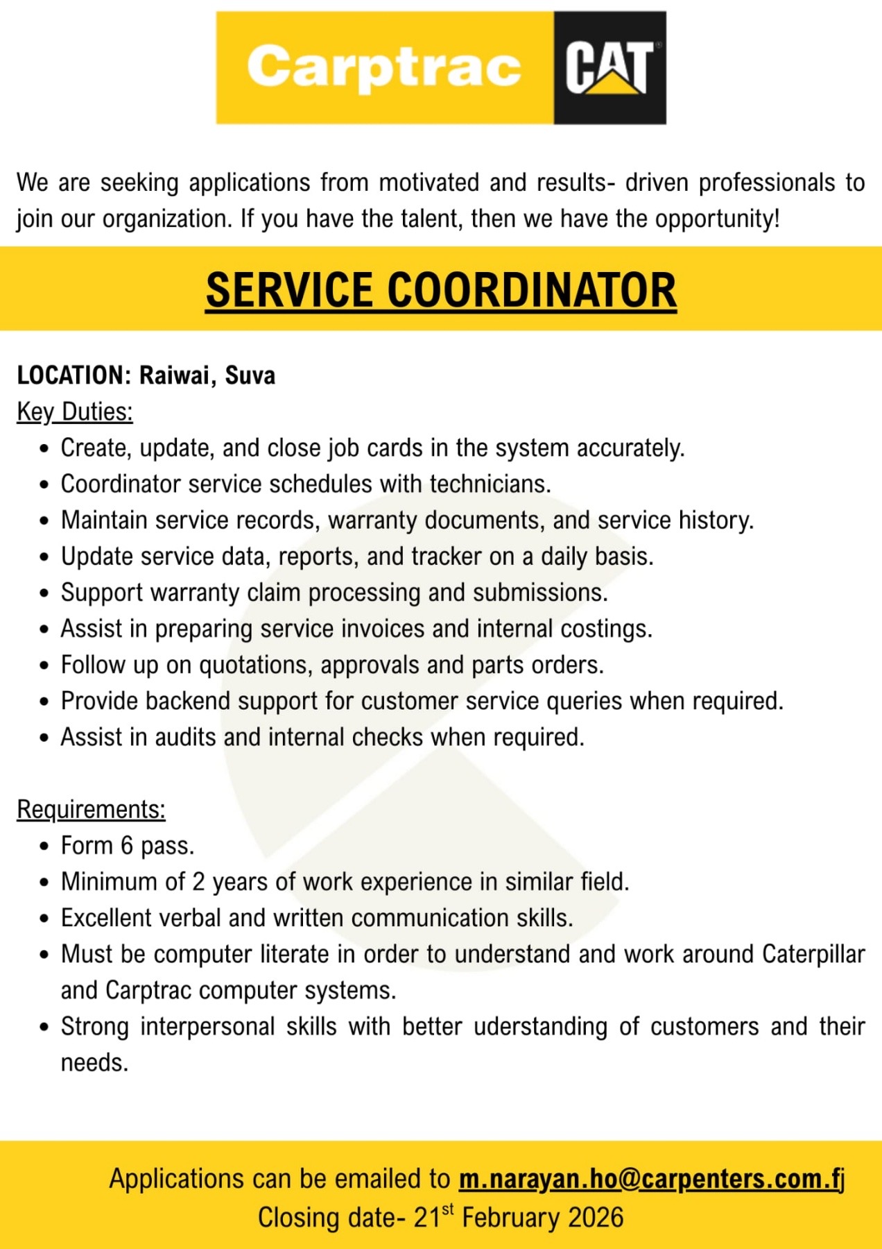 Carpenters Fiji Limited, a subsidiary of MBf Holdings, represents almost all sectors of MBf in Fiji with wholesale, retail, automotive, information technology, finance, water bottling, shipping and industrial and marine engineering industries. We are seeking applications from suitably qualified and experienced individual(s) who enjoy working in a creative team environment. If you have the drive and enthusiasm to succeed then we will surely like to hear from you!