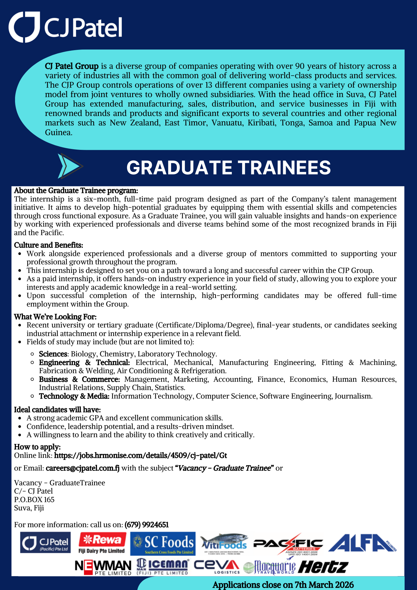 or Email: careers@cjpatel.com.fj with the subject “Vacancy - Graduate Trainee” or