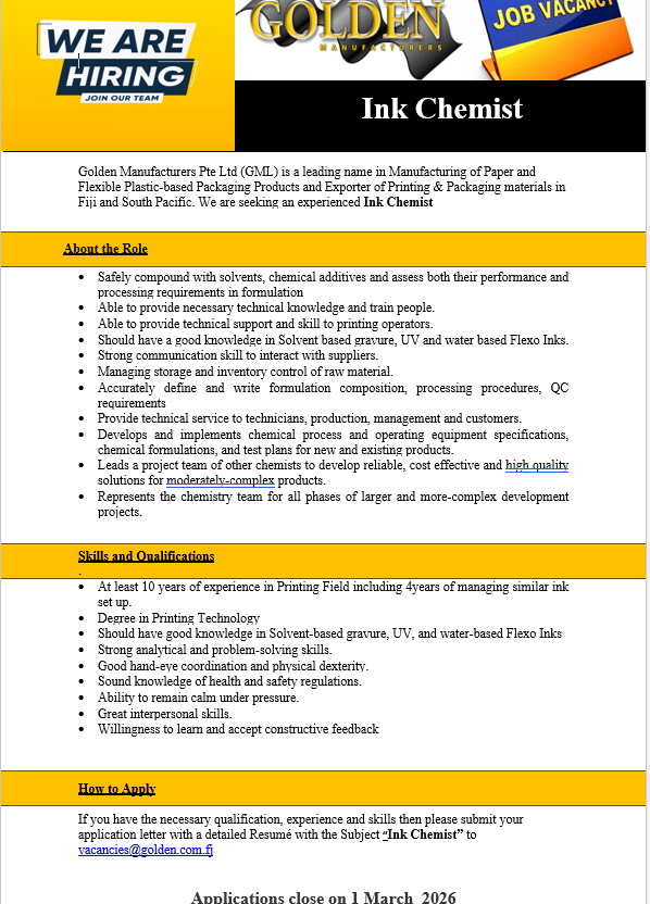 Golden was the first packaging company in the South Pacific to be locally owned and operated. Golden was the first company in Fiji to be certified with ISO 9001. Packaging and labels are manufactured in accordance with procedures that are current with ISO 9001:2009 certification.