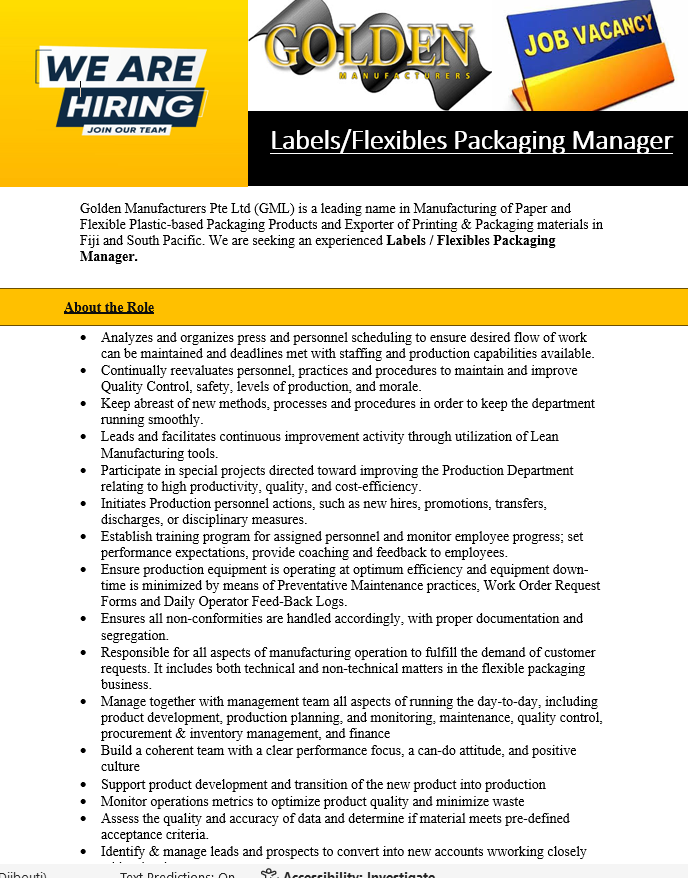 Golden Manufacturers Pte Limited (Golden) is a private company incorporated in Fiji in 1982. Golden is Fiji’s largest manufacturer of Corrugated Cardboard, Packaging and Labels for world renowned companies including but not limited to: - Fiji Water, Star-Kist, Foster Group, Nestle and Coca Cola.