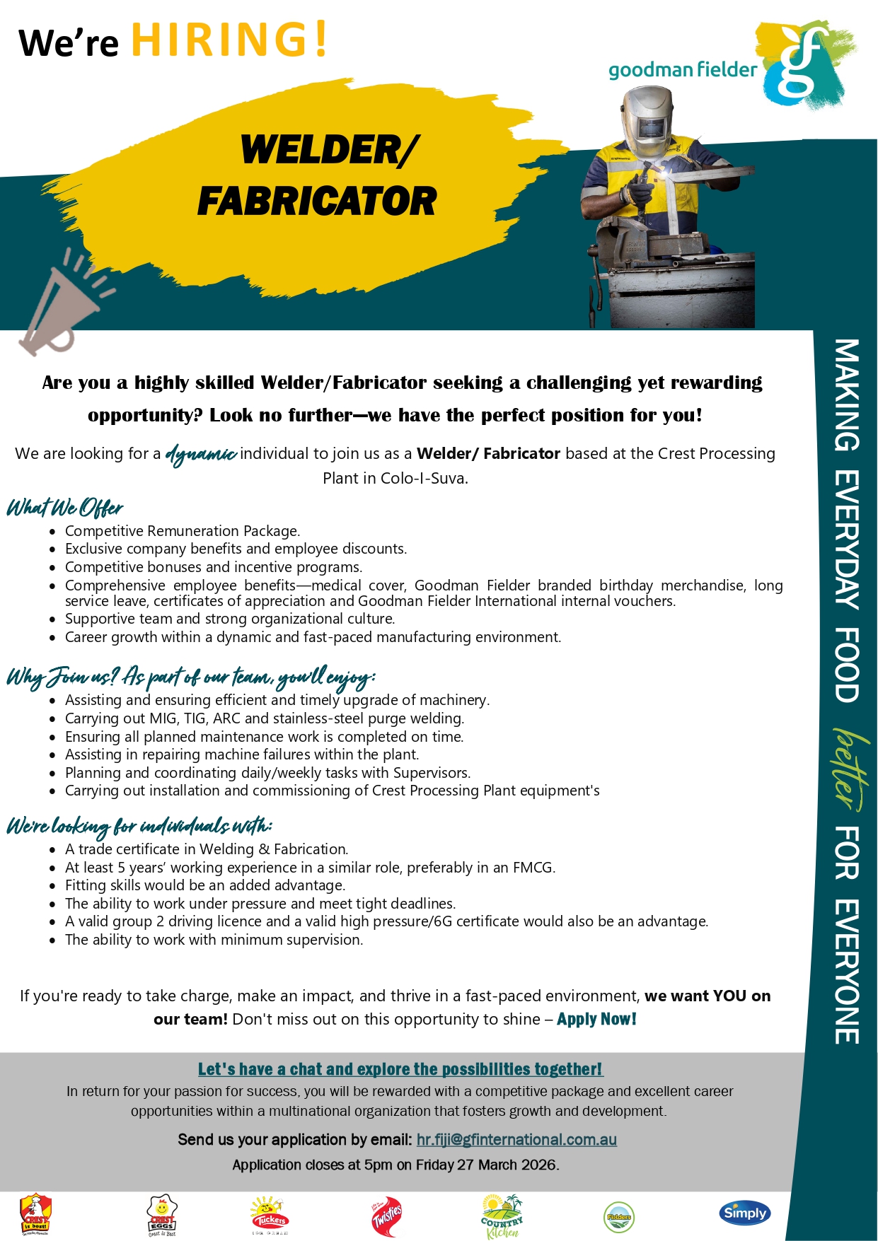 At Goodman Fielder our purpose is “making everyday food better for everyone.” We own a host of iconic brands that generations of Fijians have grown up with and trust.  Along with the aspiration to be the leading integrated food business in the region, our team believes that anything is possible! Our business focuses on the right things that make the biggest difference and one that considers our end-to-end value chain when making decisions to optimize our business. We drive change as an opportunity for us to innovate and transform our business and to achieve beyond what we think is possible.