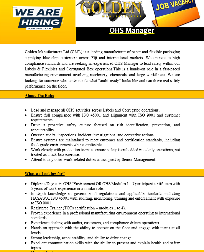 Golden Manufacturers Pte Limited (Golden) is a private company incorporated in Fiji in 1982. Golden is Fiji’s largest manufacturer of Corrugated Cardboard, Packaging and Labels for world renowned companies including but not limited to: - Fiji Water, Star-Kist, Foster Group, Nestle and Coca Cola.