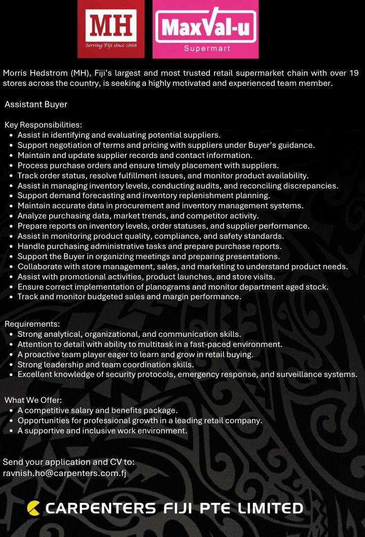 Carpenters Fiji Limited, a subsidiary of MBf Holdings, represents almost all sectors of MBf in Fiji with wholesale, retail, automotive, information technology, finance, water bottling, shipping and industrial and marine engineering industries. We are seeking applications from suitably qualified and experienced individual(s) who enjoy working in a creative team environment. If you have the drive and enthusiasm to succeed then we will surely like to hear from you!