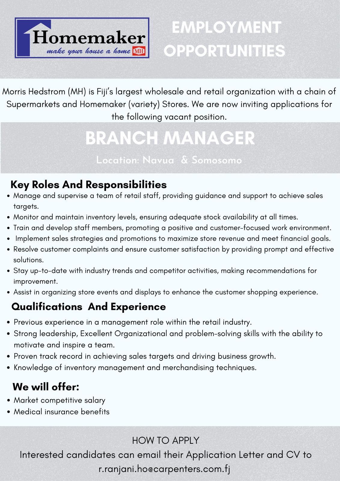 Carpenters Fiji Limited, a subsidiary of MBf Holdings, represents almost all sectors of MBf in Fiji with wholesale, retail, automotive, information technology, finance, water bottling, shipping and industrial and marine engineering industries. We are seeking applications from suitably qualified and experienced individual(s) who enjoy working in a creative team environment. If you have the drive and enthusiasm to succeed then we will surely like to hear from you!