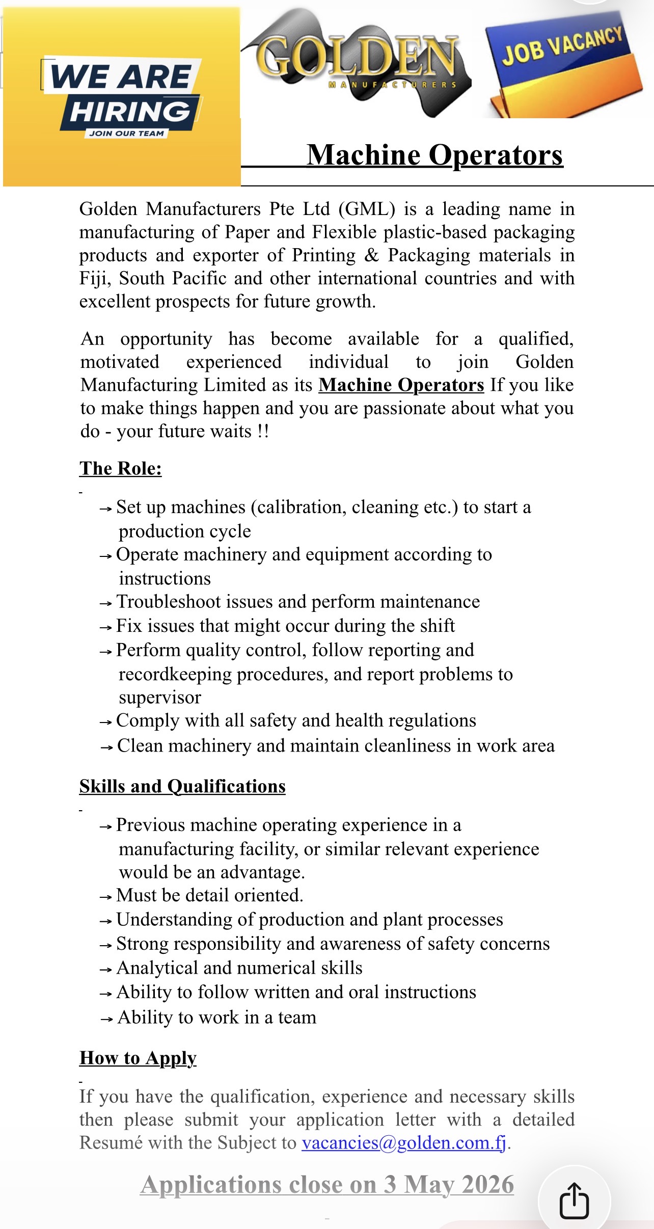 Golden Manufacturers Pte Limited (Golden) is a private company incorporated in Fiji in 1982. Golden is Fiji’s largest manufacturer of Corrugated Cardboard, Packaging and Labels for world renowned companies including but not limited to: - Fiji Water, Star-Kist, Foster Group, Nestle and Coca Cola.